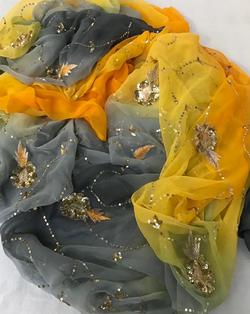 Ombre yellow shaded Aari Resham sequins Jaal saree